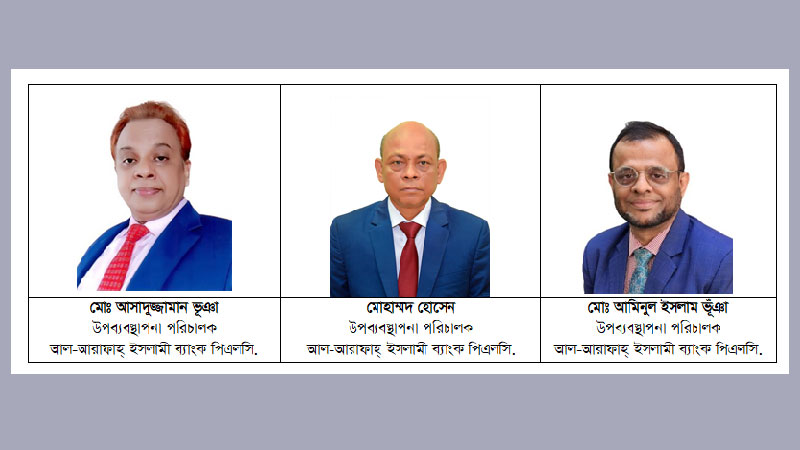 আল-আরাফাহ ইসলামী ব্যাংক (এআইবি) পিএলসি এ মোঃ আসাদুজ্জামান ভূঞা, মোহাম্মদ হোসেন ও মোঃ আমিনুল ইসলাম ভূঁঞা সম্প্রতি উপব্যবস্থাপনা পরিচালক (ডিএমডি) হিসেবে পদোন্নতি পেয়েছেন।