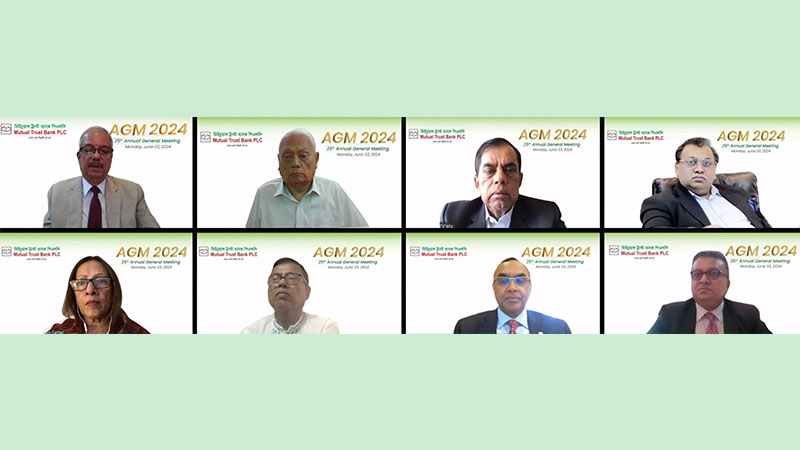 মিউচুয়াল ট্রাস্ট ব্যাংক পিএলসি’র (এমটিবি) ২৫তম বার্ষিক সাধারণ সভা (এজিএম) সোমবার (০৩ জুন) ডিজিটাল প্লাটফর্মের মাধ্যমে অনুষ্ঠিত হয়েছে। এতে ১০ শতাংশ নগদ লভ্যাংশ অনুমোদন করেছে প্রতিষ্ঠানটি।