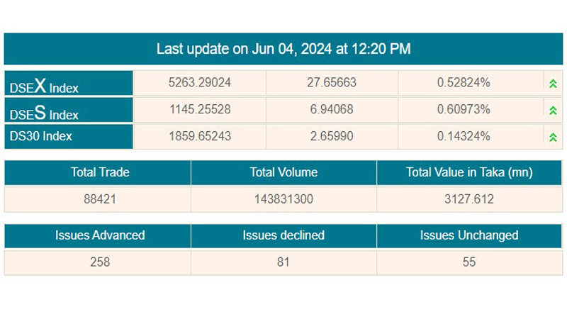 সূত্র মতে, বেলা ১২টা ২০ পর্যন্ত ডিএসইর প্রধান সূচক বা ‘ডিএসইএক্স’ সূচক ২৭ দশমিক ৬৫ পয়েন্ট বেড়ে অবস্থান করছে ৫ হাজার ২৬৩ পয়েন্টে। অন্য সূচকগুলোর মধ্যে শরিয়াহ সূচক ‘ডিএসইএস সূচক ৬ দশমিক ৯৪ পয়েন্ট বেড়ে ১ হাজার ১৪৫ পয়েন্টে এবং ‘ডিএস৩০’ সূচক ২ দশমিক ৬৫ পয়েন্ট বেড়ে ১ হাজার ৮৫৯পয়েন্টে দাড়িয়েছে।