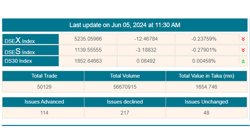 সূত্র মতে, বেলা ১১টা ৩০ পর্যন্ত ডিএসইর প্রধান সূচক বা ‘ডিএসইএক্স’ সূচক ১২ দশমিক ৪৬ পয়েন্ট কমে অবস্থান করছে ৫ হাজার ২৩৫ পয়েন্টে। অন্য সূচকগুলোর মধ্যে শরিয়াহ সূচক ‘ডিএসইএস সূচক ৩ দশমিক ১৮ পয়েন্ট কমে ১ হাজার ১৩৯ পয়েন্টে এবং ‘ডিএস৩০’ সূচক ০ দশমিক ০৮ পয়েন্ট বেড়ে ১ হাজার ৮৫২পয়েন্টে দাড়িয়েছে।