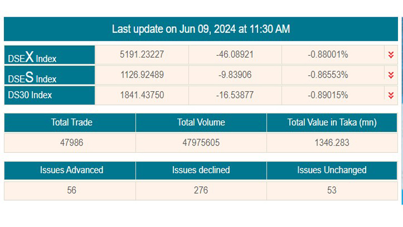 সূত্র মতে, বেলা ১১টা ৩০ পর্যন্ত ডিএসইর প্রধান সূচক বা ‘ডিএসইএক্স’ সূচক ৪৬ দশমিক ০৮ পয়েন্ট কমে অবস্থান করছে ৫ হাজার ১৯১ পয়েন্টে। অন্য সূচকগুলোর মধ্যে শরিয়াহ সূচক ‘ডিএসইএস সূচক ৯ দশমিক ৮৩ পয়েন্ট কমে ১ হাজার ১২৬ পয়েন্টে এবং ‘ডিএস৩০’ সূচক ১৬ দশমিক ৫৩ পয়েন্ট কমে ১ হাজার ৮৪১পয়েন্টে দাড়িয়েছে।