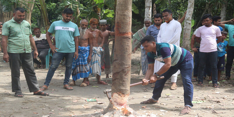 এমন ঘটনায় মূলধারার বেশ কয়েকটি গণমাধ্যমে সংবাদ প্রকাশিত হলে নড়েচড়ে বসে স্থানীয় প্রশাসন। শনিবার (২২ জুন) সকালে মুকসুদপুর থানার ভারপ্রাপ্ত কর্মকর্তা (ওসি) জিল্লুর রহমান ও স্থানীয় চেয়ারম্যান সাহিদুর রহমান টুটুলের হস্তক্ষেপে গাছটি কেটে ফেলা হয়। এ সময় গাছ কাঁটা দেখতে ভিড় করেন এলাকাবাসী।