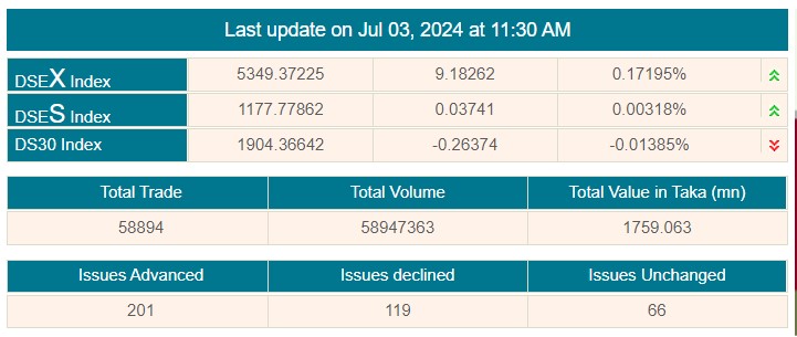 সূত্র মতে, বেলা ১১টা ৩০ পর্যন্ত ডিএসইর প্রধান সূচক বা ‘ডিএসইএক্স’ সূচক ০৯ দশমিক ১৮ পয়েন্ট বেড়ে অবস্থান করছে ৫ হাজার ৩৪৯ পয়েন্টে। অন্য সূচকগুলোর মধ্যে শরিয়াহ সূচক ‘ডিএসইএস’ ০ দশমিক ০৩ পয়েন্ট বেড়ে ১ হাজার ১৭৭ পয়েন্টে এবং ‘ডিএস৩০’ সূচক ০ দশমিক ২৬ পয়েন্ট কমে ১ হাজার ৯০৪ পয়েন্টে দাড়িয়েছে।