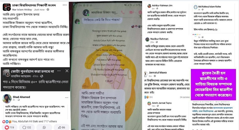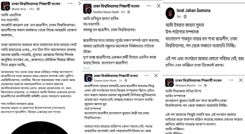 সদ্য পদত্যাগ করা নেতারা হলেন– ঢাকা বিশ্ববিদ্যালয়ের রোকেয়া হলের সহ সভাপতি জান্নাতুল মাওয়া, জাতির জনক বঙ্গবন্ধু শেখ মুজিবুর রহমান হল ছাত্রলীগের সহ সভাপতি হাসিবুল হাসান হাসিব, বাংলাদেশ কুয়েত মৈত্রী হলের অর্থ সম্পাদক জুয়েনা আলম মুন, আইন সম্পাদক সিরাজাম মনিরা তিশা, প্রচার সম্পাদক আমরিন জান্নাত তাইরু এবং নাট্য ও সাহিত্য বিষয়ক সম্পাদক মেহেরুন্নিসা মিম, সামাজিক বিজ্ঞান অনুষদ শাখা ছাত্রলীগের সহ সভাপতি নুরুল ইসলাম হৃদয়, বিজ্ঞান উপ-সম্পাদক জেবা সায়ীমা, সার্জেন্ট জহরুল হক হল ছাত্রলীগের সহ সভাপতি ওয়াসিক, শামসুন নাহার হল ছাত্রলীগের উপ-পাঠাগার সম্পাদক ইসরাত জাহান সুমনা, বিজয় একাত্তর হল শাখার গ্রন্থনা ও প্রকাশনা উপ-সম্পাদক শাহ সাকিব সাদমান প্রান্ত, জসীমউদ্দিন হল ছাত্রলীগের মো. রাফিউল ইসলাম রাফি, কার্যনির্বাহী সদস্য মেহেদী হাসান।
