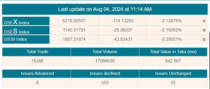 সপ্তাহের প্রথম কার্যদিবস (০৪ আগস্ট) দেশের প্রধান পুঁজিবাজার ঢাকা স্টক এক্সচেঞ্জ (ডিএসই) মূল্য সূচকের ব্যাপক পতনে চলছে লেনদেন। এদিন লেনদেন শুরুর প্রথম ঘন্টায় কমেছে ৩৫৩ কোম্পানির শেয়ারের দর।