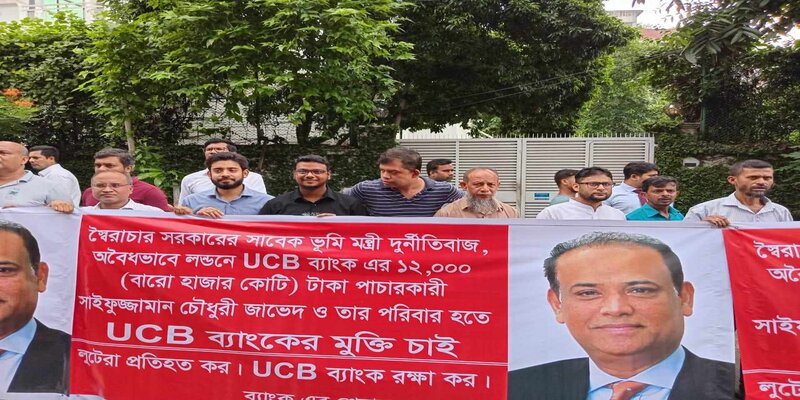 বৃহস্পতিবার (৮ আগস্ট) গুলশানে ইউসিবির প্রধান কার্যালয়ের সামনে অবস্থান নিয়ে তাঁরা এই দাবি জানান। এই সময় তাঁরা বিভিন্ন ফেস্টুন প্রদর্শন করে সাবেক ভূমিমন্ত্রীর ‘বিদেশে অর্থ পাচার’ ও ব্যাংকটির নানা অনিয়ম নিয়ে অভিযোগ উত্থাপন করেন।
