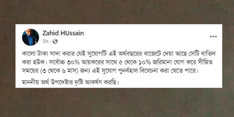 ফেসবুক স্ট্যাটাসে জাহিদ হোসেন বলেন, কালোটাকা সাদা করার যে সুযোগটি এই অর্থবছরের বাজেটে দেওয়া আছে, সেটি বাতিল করা হোক। সর্বোচ্চ আয়করের সঙ্গে ৫ থেকে ১০ শতাংশ জরিমানা যোগ করে সীমিত সময়ের (৩ থেকে ৬ মাস) জন্য এই সুযোগ পুনর্বহাল করার বিষয়টি বিবেচনা করা যেতে পারে।