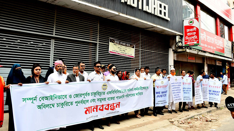 মানববন্ধনের সমন্বয়ক জাকারিয়া আল মাহমুদ বলেন, ২০২০ সালে দেশে করোনা মহামারির কারণে ব্যবসা-বাণিজ্য এবং জনজীবনে মারাত্মক সংকট নেমে আসে। সেই দুর্যোগময় মুহুর্তে এফবিসিসিআইয়ের প্রেসিডেন্ট শেখ ফজলে ফাহিম দলীয়করণের নামে ৬২জন কর্মকর্তা-কর্মচারীকে জোরপূর্বক পদত্যাগে বাধ্য করেন। এছাড়াও প্রাপ্য সার্ভিস বেনিফিট থেকেও তাদের বঞ্চিত করেন।