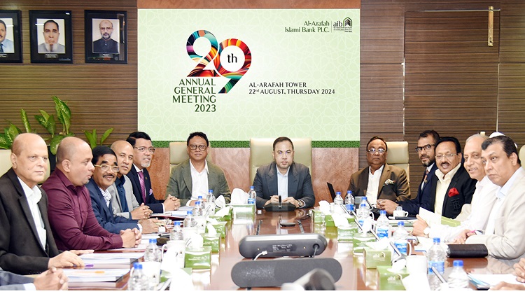 আল-আরাফাহ্ ইসলামী ব্যাংক পিএলসি’র ২৯তম বার্ষিক সাধারণ সভায় (এজিএম) ২০২৩ সালের সমাপ্ত বছরের জন্য ১০ শতাংশ নগদ লভ্যাংশ ও ৫ শতাংশ স্টক ডিভিডেন্ড বা বোনাস শেয়ার অনুমোদিত হয়েছে। বৃহস্পতিবার (২২ আগস্ট) অনুষ্ঠিত বার্ষিক সাধারণ সভায় ব্যাংকের পরিচালনা পর্ষদের চেয়ারম্যান আলহাজ্ব সেলিম রহমান সভাপতিত্ব করেন।