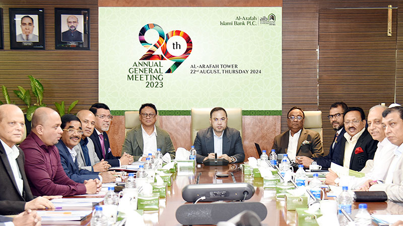 আল-আরাফাহ্ ইসলামী ব্যাংক (এআইবি) পিএলসি’র ২৯তম বার্ষিক সাধারণ সভায় (এজিএম) ২০২৩ সালের সমাপ্ত বছরের জন্য ১০ শতাংশ নগদ লভ্যাংশ ও ৫ শতাংশ বোনাস শেয়ার অনুমোদিত হয়েছে। বৃহস্পতিবার (২২ আগস্ট) এজিএমে ব্যাংকের পরিচালনা পর্ষদের চেয়ারম্যান সেলিম রহমান সভাপতিত্ব করেন।