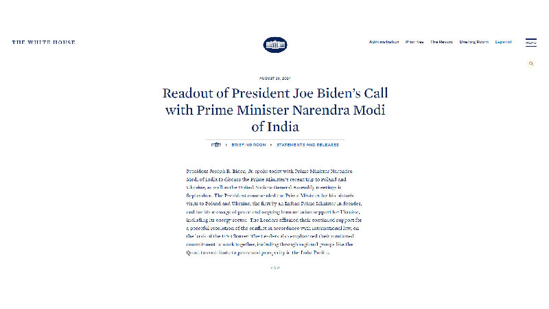 হোয়াইট হাউসের প্রেস বিজ্ঞপ্তিতে বলা হয়েছে, প্রেসিডেন্ট জো বাইডেন আজ ভারতের প্রধানমন্ত্রী নরেন্দ্র মোদির সাথে কথা বলেছেন। মোদির সাম্প্রতিক পোল্যান্ড ও ইউক্রেন সফরের পাশাপাশি আগামী সেপ্টেম্বরে জাতিসংঘের সাধারণ পরিষদের বৈঠক নিয়ে আলোচনা হয়েছে। পোল্যান্ড এবং ইউক্রেনে তার ঐতিহাসিক সফর ও জ্বালানি সেক্টরসহ ইউক্রেনের জন্য শান্তি ও চলমান মানবিক সহায়তার বার্তা দেওয়ায় প্রেসিডেন্ট বাইডেন মোদির প্রশংসা করেছেন।