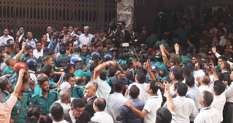 মঙ্গলবার (২৭ আগস্ট) বিকাল ৫টা ১০ মিনিটে সিএমএম কোর্টের নিচে এই ঘটনা ঘটে। এ সময় আইনজীবীরা ইনুর গায়ের চামড়া, তুলে নেবো আমরা; ফাঁসি ফাঁসি ফাঁসি চাই, খুনি ইনুর ফাঁসি চাই বলে বিভিন্ন স্লোগান দেন।