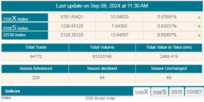 দেশের প্রধান পুঁজিবাজার ঢাকা স্টক এক্সচেঞ্জে (ডিএসই) সপ্তাহের প্রথম কার্যদিবস রবিবার (৮ সেপ্টেম্বর) মূল্যসূচকের উত্থানের মধ্য দিয়ে চলছে লেনদেন। বেড়েছে বেশির ভাগ কোম্পানির শেয়ারদর।