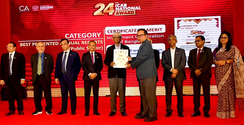 ২৪তম আইসিএবি ন্যাশনাল এ্যাওয়ার্ডের পাবলিক সেক্টর এনটিটি ক্যাটেগরিতে ইনভেস্টমেন্ট কর্পোরেশন অব বাংলাদেশকে (আইসিবি) সার্টিফিকেট অব মেরিট পুরস্কারে ভূষিত করা হয়েছে।