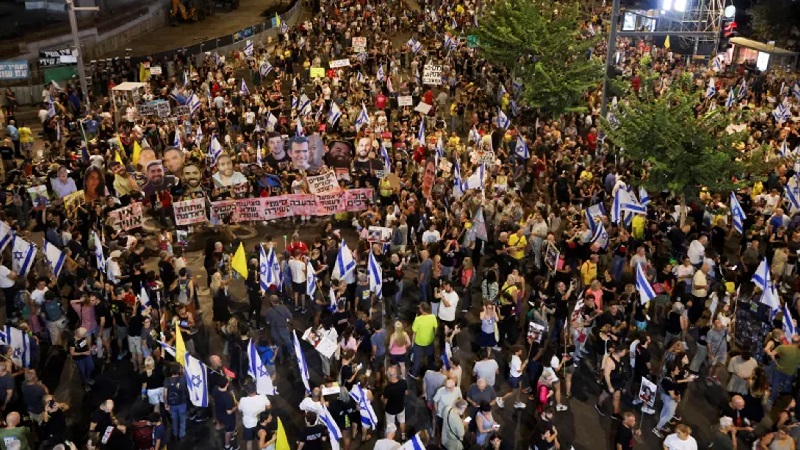 গাজায় বন্দি ইসরায়েলিদের মুক্তির জন্য আন্তরিক প্রচেষ্টার আহ্বান জানিয়ে তেল আবিবের রাজপথে ব্যাপক বিক্ষোভ করেছেন সরকারবিরোধী ইসরায়েলিরা। এসময় বিক্ষোভকারীরা প্রধানমন্ত্রী বেনিয়ামিন নেতানিয়াহু সরকারের বিরুদ্ধে স্লোগান দেন।