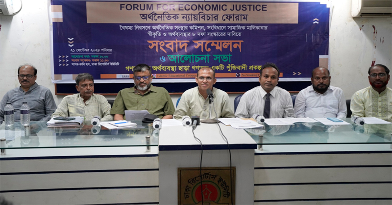 অর্থনৈতিক বৈষম্য নিরসনে সংস্কার কমিশন গঠন, সংবিধানে সামাজিক মালিকানার স্বীকৃতি ও অর্থব্যবস্থার ৮ দফা সংস্কার প্রস্তাবনা নিয়ে সংবাদ সম্মেলন ও আলোচনা সভা করেছে ফোরাম ফর ইকোনোমিক জাস্টিস (ফিজা)। গতকাল শনিবার সকাল ১১টায় ঢাকা রিপোর্টার্স ইউনিটির সাগর-রুনি হলে আয়োজিত এ অনুষ্ঠানে বক্তারা বলেন, শোষণমুক্ত গণতান্ত্রিক রাষ্ট্র বা সমাজ গড়ে তোলার প্রথম এবং প্রধান শর্তই হচ্ছে অর্থব্যবস্থার গণতান্ত্রয়ন।