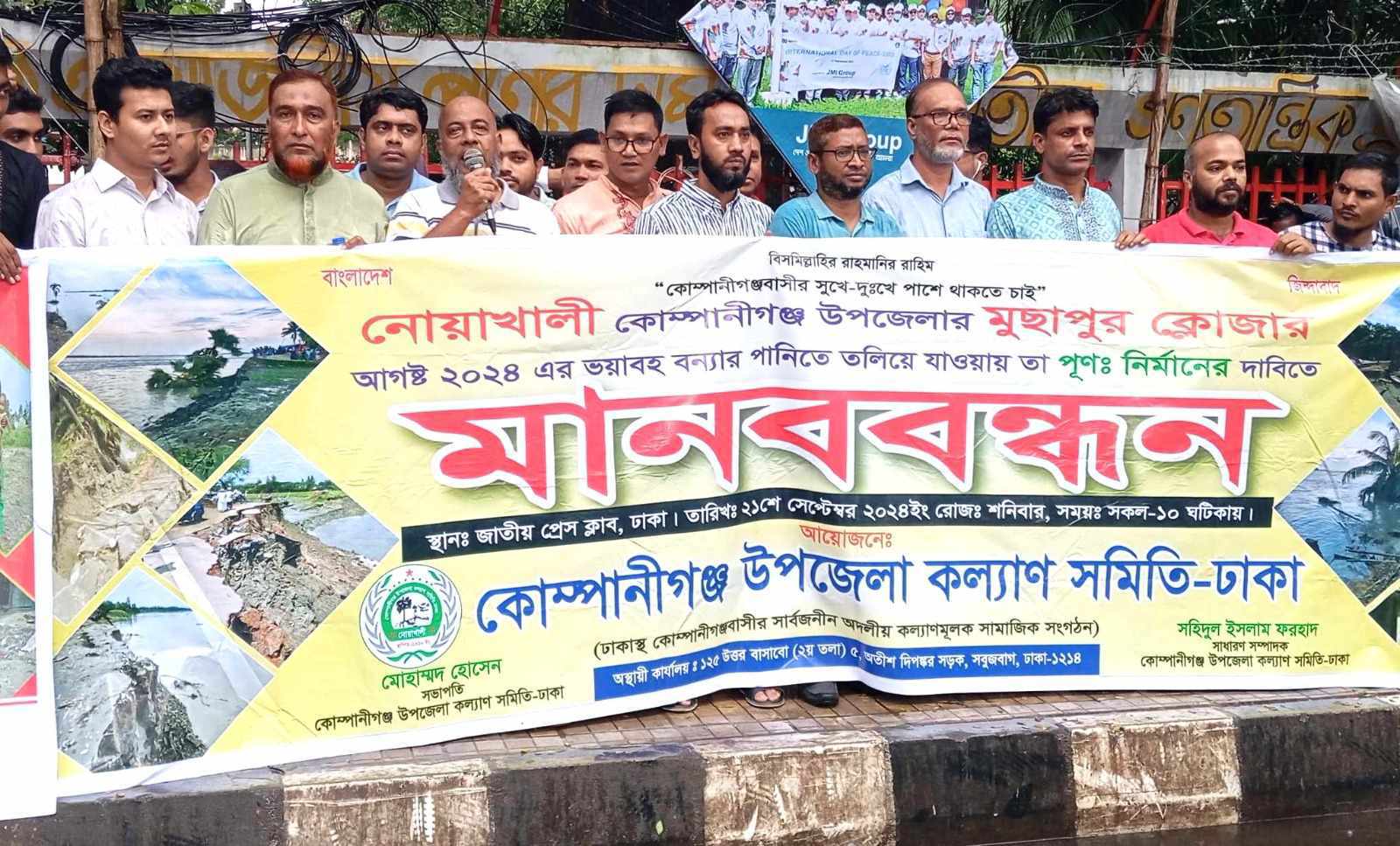 ঢাকাস্থ কোম্পানীগঞ্জবাসী সহ নোয়াখালীর সর্বস্তরের মানুষের অংশগ্রহনে নদীভাঙ্গনরোধ থেকে কোম্পানীগঞ্জ কে রক্ষা ও দ্রুত মুছাপুর ক্লোজার পুনঃনির্মাণের দাবিতে মানববন্ধন অনুষ্ঠিত হয়েছে।