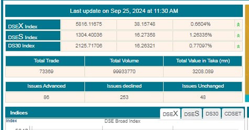 শরিয়াহ সূচক বা ‘ডিএসইএস’ ১৬ দশমিক ২৭ পয়েন্ট বেড়ে দাঁড়িয়েছে ১ হাজার ৩০৪ পয়েন্টে আর ‘ডিএস-৩০’ সূচক ১৬ দশমিক ২৬ পয়েন্ট বেড়ে দাঁড়িয়েছে ২ হাজার ১২৫ পয়েন্টে।