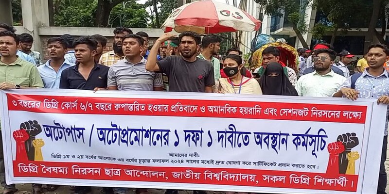 নাম প্রকাশে অনিচ্ছুক জাতীয় বিশ্ববিদ্যালয়ের একজন কর্মকর্তা গণমাধ্যমে বলেন, ‘ডিগ্রিতে অটোপাসের এক দফা দাবিতে জাতীয় বিশ্ববিদ্যালয়ে শিক্ষার্থীরা অবস্থান কর্মসূচি পালন করছেন।’