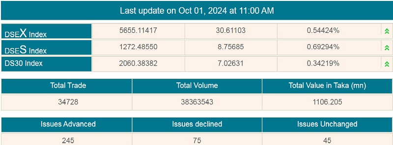 সূত্র মতে, আজ ডিএসইর লেনদেন শুরুর ১ ঘণ্টায় অর্থাৎ বেলা ১১ টা পর্যন্ত ডিএসইর প্রধান সূচক বা ‘ডিএসইএক্স’ ৩০ দশমিক ৬১ পয়েন্ট বেড়ে অবস্থান করছে ৫ হাজার ৬৫৫ পয়েন্টে।