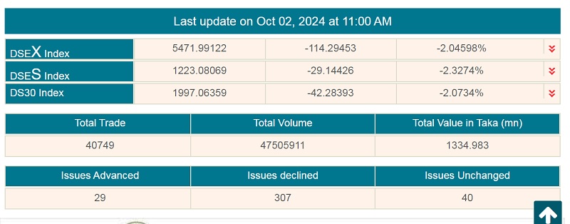 দেশের প্রধান পুঁজিবাজার ঢাকা স্টক এক্সচেঞ্জে (ডিএসই) সপ্তাহের ৪র্থ কার্যদিবস বুধবার (০২ অক্টোবর) মূল্যসূচকের ব্যাপক পতনে চলছে লেনদেন। কমেছে বেশির ভাগ কোম্পানির শেয়ার দর।