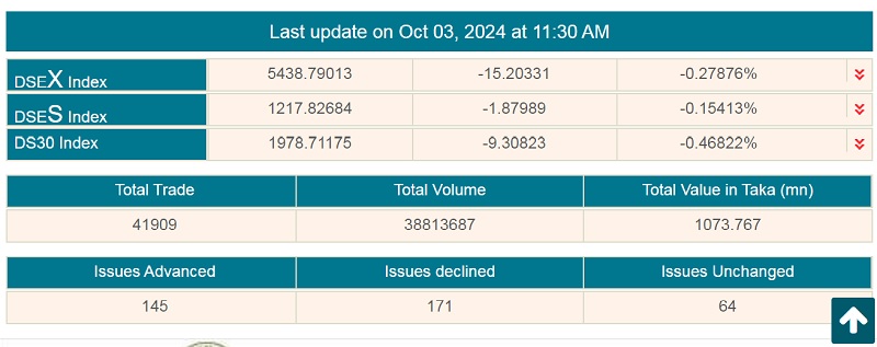 সূত্র মতে, আজ ডিএসইর লেনদেন শুরুর দেড় ঘণ্টায় অর্থাৎ বেলা ১১ টা ৩০ মিনিট পর্যন্ত ডিএসইর প্রধান সূচক বা ‘ডিএসইএক্স’ ১৫ দশমিক ২০ পয়েন্ট কমে অবস্থান করছে ৫ হাজার ৪৩৮ পয়েন্টে।