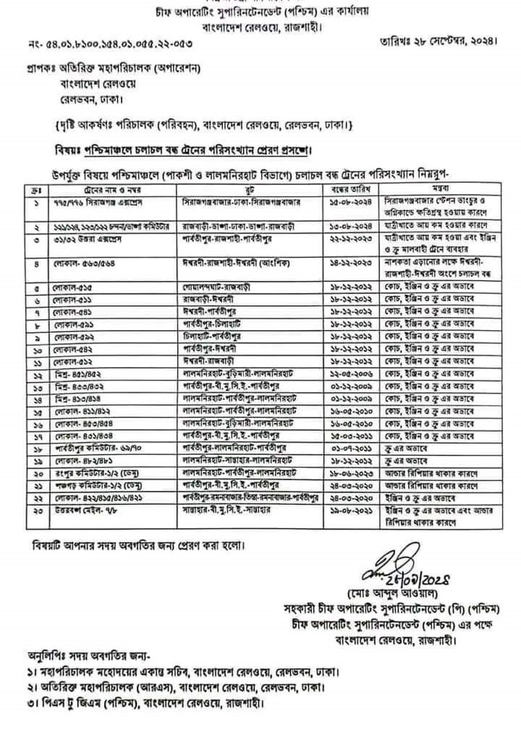 গত ২৮ সেপ্টেম্বর রেল পশ্চিমাঞ্চলের সহকারী চীফ অপারেটিং সুপারিনটেনডেন্ট আব্দুল আওয়াল স্বাক্ষরিত এক অফিস আদেশে ট্রেন বন্ধের বিষয়টি নিশ্চিত করা হয়।