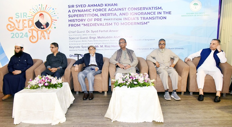 প্রধান অতিথি, ব্র্যাক বিশ্ববিদ্যালয়ের ভাইস-চ্যান্সেলর ডক্টর সৈয়দ ফেরহাত আনোয়ার, বর্তমান শিক্ষাপ্রতিষ্ঠানগুলিতে স্যার সৈয়দের শিক্ষাগত দৃষ্টিভঙ্গির চলমান প্রভাবের উপর জোর দিয়ে একটি অন্তর্দৃষ্টিপূর্ণ ভাষণ দেন। পররাষ্ট্র মন্ত্রণালয়ের অতিরিক্ত সচিব এম. রিয়াজ হামিদুল্লাহ মূল বক্তব্য প্রদান করেন। বিশেষ অতিথি ইঞ্জিনিয়ার মহিউদ্দিন খান তার ভাবনা তুলে ধরেন।