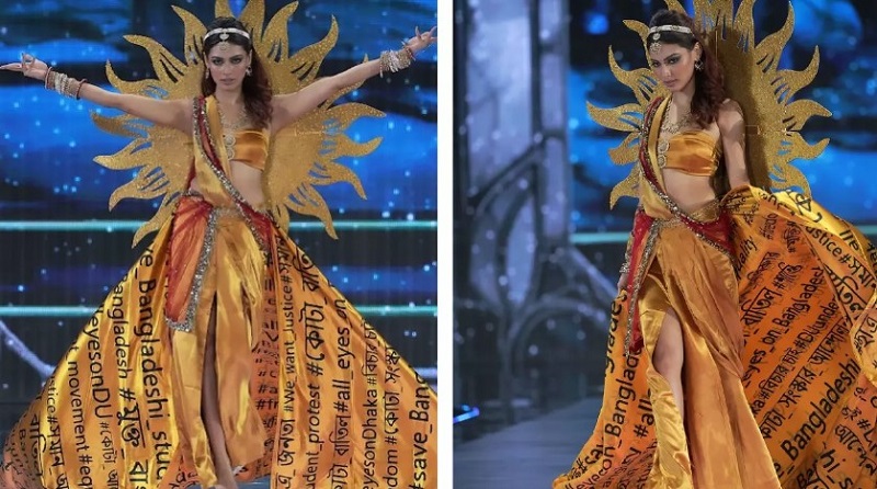 ‘#কোটা_আন্দোলন’, ‘#মুক্তি’, ‘#ছাত্র_জনতা’, ‘#মুক্ত_বাংলা’, ‘#শান্তি’, ‘#save_Bangladeshi_students’, ‘#freedom’, ‘#কোটা_বাতিল’, ‘#সমান_অধিকার’, ‘#peace’, ‘#Victory’, ‘#Bangladeshi_student_movement’, ‘#কোটা_বাতিল’, ‘#বিচার_চাই’ –এরকম হ্যাশট্যাগ গুলো কালো রঙে ছাপা হয় সর্ষে রঙের শাড়িতে। সোনালী পাড় এবং কমলা রঙের আঁচলে সাজানো হয়েছে শাড়িটি। দেশের নতুন সূচনার শুভ সকালকে কেন্দ্র করতে পিঠে একটি সোনালি জরির সূর্য এঁটে পোশাককে পূর্ণতা দেন জেসিয়া। সঙ্গে হার, ঝুমকা, টায়রা, কোমরবন্ধনীসহ ভারি গয়না আর হাত ভর্তি চুরিতে সেজেছেন তিনি।