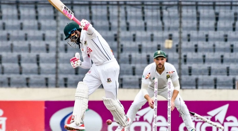 পরের ওভারেই আউট হন মুশফিকুর রহিম। ২ বলে ০ রানে ডেন পিটারসনের বলে টনি ডি জর্জির হাতে ক্যাচ হন তিনি।