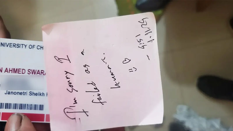 তাজরিয়ান আহমেদ সোয়ারা নামের চট্টগ্রাম বিশ্ববিদ্যালয়ের (চবি) এক নারী শিক্ষার্থী আত্মহত্যা করেছেন। তার মরদেহের পাশ থেকে ‘আমি দুঃখিত, আমি ব্যর্থ একজন মানুষ’ ইংরেজিতে লেখা একটি চিরকুট পাওয়া গেছে।
