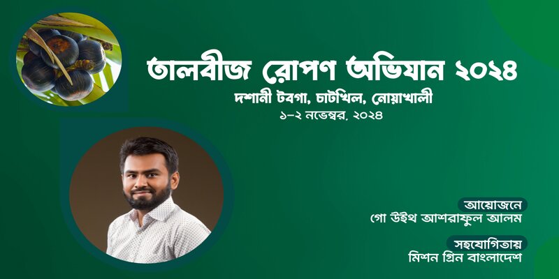 নোয়াখালী জেলার চাটখিল উপজেলার দশানী টবগা গ্রামে প্রায় ২ কিলোমিটার এলাকাজুড়ে দুইদিনব্যাপী তালবীজ রোপন কার্যক্রম শেষ হয় শনিবার (২ নভেম্বর)। এই কার্যক্রমে সহযোগী হিসেবে ছিল মিশন গ্রিন বাংলাদেশ।