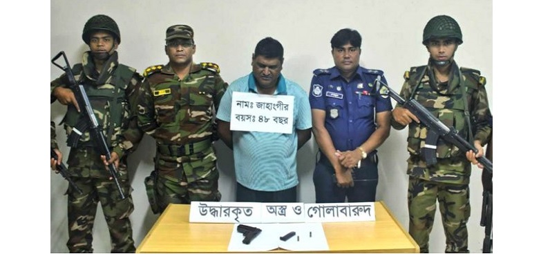 বিষয়টি নিশ্চিত করে সেনা কর্মকর্তা ক্যাপ্টেন রিমান রাফিন নিশাত বলেন, ‘গোয়েন্দা তথ্যের ভিত্তিতে অভিযান চালিয়ে জাহাঙ্গীর ফরাজির বাড়ি তল্লাশি করা হয়। এ সময় বাড়ির দুটি ভিন্ন কক্ষে লুকিয়ে রাখা যুক্তরাষ্ট্রের তৈরি একটি অত্যাধুনিক ৭.৬৫ এমএম পিস্তল, একটি ম্যাগাজিন ও দুই রাউন্ড গুলি উদ্ধার করা হয়। অস্ত্র উদ্ধারের পরে তাকে আটক করা হয়েছে এবং তার বিরুদ্ধে পরবর্তী আইনি পদক্ষেপ নেওয়া হচ্ছে।’