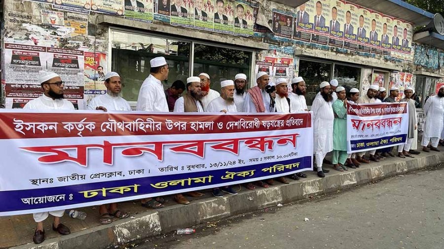 বুধবার (১৩ নভেম্বর) জাতীয় প্রেস ক্লাবের সামনে ঢাকা ওলামা ঐক্য পরিষদের আয়োজনে ‘ইসকন কর্তৃক যৌথ বাহিনীর ওপর হামলা ও দেশবিরোধী ষড়যন্ত্রের প্রতিবাদে’ অনুষ্ঠিত মানববন্ধনে এ দাবি জানায় সংগঠনটি।