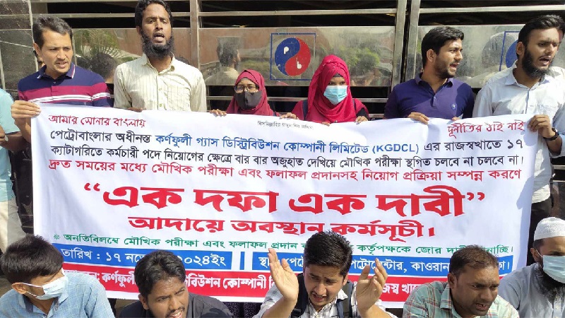 আন্দোলনকারীরা বলছেন, পেট্রোবাংলার অধীনস্থ কর্ণফুলী গ্যাস ডিস্ট্রিবিউশন কোম্পানি লিমিটেডের রাজস্বখাতে ১৭ ক্যাটাগরিতে কর্মচারী পদে নিয়োগের ক্ষেত্রে বারবার অজুহাত দেখিয়ে মৌখিক পরীক্ষা স্থগিত করা হচ্ছে। আমাদের দাবি দ্রুত যেন মৌখিক পরীক্ষা সম্পন্ন করা হয় এবং ফলাফল প্রকাশ করে নিয়োগ প্রক্রিয়া শেষ করা হয়। আমাদের এই এক দফা দাবি না মানা পর্যন্ত আমরা আমাদের অবস্থান কর্মসূচি থেকে ফিরে যাব না। আমাদের এই এক দফা দাবি না মানা পর্যন্ত আমরা অবস্থান কর্মসূচি থেকে ফিরে যাবো না।