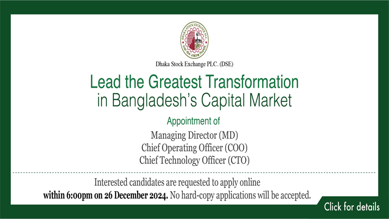 তারই অংশ হিসেবে আজ ঢাকা স্টক এক্সচেঞ্জের ব্যবস্থাপনা পরিচালক (এমডি), প্রধান পরিচালনা কর্মকর্তা (সিওও) এবং প্রধান প্রযুক্তি কর্মকর্তা (সিটিও)নিয়োগের জন্য জাতীয় দৈনিক পএিকায় বিজ্ঞপ্তি প্রকাশ করেছে। প্রত্যকটা পদের জন্য আবেদনের শেষ তারিখ ২৬ ডিসেম্বর ২০২৪ তারিখ সন্ধা ৬ ঘটিকা পর্যন্ত এবং ৪ ডিসেম্বর তারিখ ২০২৪ সন্ধা ৬ ঘটিকায় ডিএসইর চেয়ারম্যান ও পরিচালনা পর্ষদের সাথে আগ্রহী প্রার্থীদের ডিএসই সম্পর্কে ধারনা দেয়ার জন্য ভার্চুয়ালি এক আলোচনা সভার আয়োজন করা হয়েছে