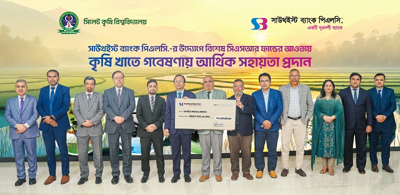 সাউথইস্ট ব্যাংক পিএলসি বিশেষ সিএসআর তহবিলের আওতায় সিলেট কৃষি বিশ্ববিদ্যালয়কে গবেষণা কাজ পরিচালনার জন্য বিশেষ আর্থিক সহায়তা প্রদান করেছে।