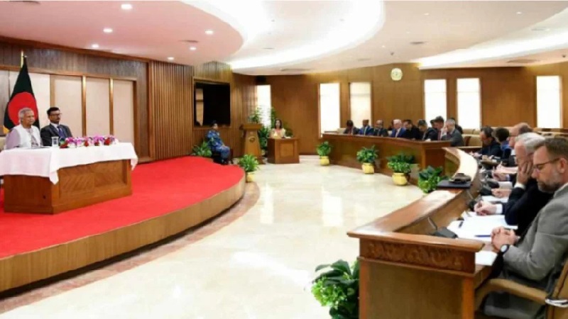 সোমবার (৯ ডিসেম্বর) দুপুরে তেজগাঁওয়ে প্রধান উপদেষ্টার কার্যালয়ে বৈঠকটি শুরু হয়। বৈঠকে ইউরোপীয় ইউনিয়নের প্রতিনিধি দলের নেতৃত্ব দেন বাংলাদেশে নিযুক্ত ইউরোপীয় ইউনিয়নের হেড অব ডেলিগেশন মাইকেল মিলার।