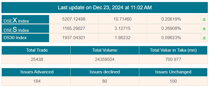 সূত্র মতে, আজ ডিএসইর লেনদেন শুরুর প্রথম ঘণ্টায় অর্থাৎ বেলা ১১ টা পর্যন্ত ডিএসইর প্রধান সূচক বা ‘ডিএসইএক্স’ ১০ দশমিক ৭১ পয়েন্ট বেড়ে অবস্থান করছে ৫ হাজার ২০৭ পয়েন্টে।