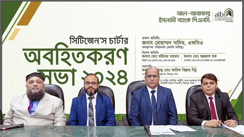 আল-আরাফাহ্ ইসলামী ব্যাংক (এআইবি) পিএলসির মিরপুর শাখায় সিটিজেন’স চার্টার অবহিতকরণ সভা অনুষ্ঠিত হয়েছে। সোমবার (২৩ ডিসেম্বর) সভাটি অনুষ্ঠিত হয়।