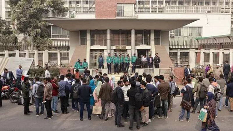 বুধবার (১ জানুয়ারি) সচিবালয়ের সামনে অবস্থান কর্মসূচি থেকে প্রজ্ঞাপনে অন্তর্ভুক্তির দাবি জানিয়েছেন চাকরিপ্রার্থীরা।