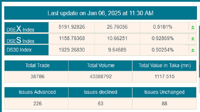 সূত্র মতে, আজ ডিএসইর লেনদেন শুরুর প্রথম দেড় ঘন্টায় অর্থাৎ সাড়ে ১১ টা পর্যন্ত ডিএসইর প্রধান সূচক বা ‘ডিএসইএক্স’ ২৬ দশমিক ৭৬ পয়েন্ট বেড়ে অবস্থান করছে ৫ হাজার ১৯১ পয়েন্টে।
