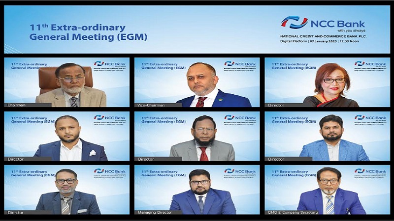 বিজ্ঞপ্তিতে বলা হয়েছে, ন্যাশনাল ক্রেডিট এন্ড কমার্স ব্যাংক পিএলসির ১১তম বিশেষ সাধারণ সভা (ইজিএম) ডিজিটাল প্ল্যাটফর্মে অনুষ্ঠিত হয়। সভায় ব্যাংকের অধ্যাদেশ আইনের ৯১, ৯৪(১) এবং ৯৪(২) নং আর্টিকেলের সংশোধনী প্রস্তাব অনুমোদিত হয়।