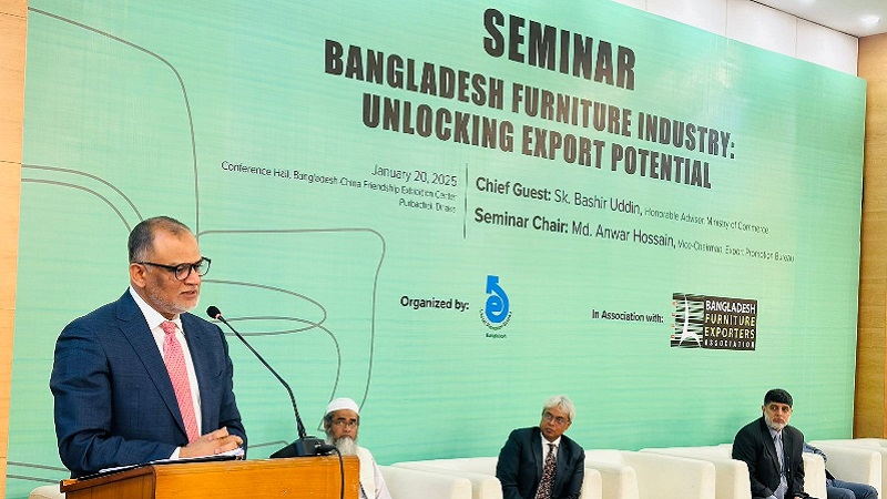 সোমবার (২০ জানুয়ারি) দুপুরে পূর্বাচলে বাংলাদেশ-চায়না ফ্রেন্ডশিপ এক্সিবিশন সেন্টারের কনফারেন্স হলে এক্সপোর্ট প্রমোশন ব্যুরো ও বাংলাদেশ ফার্নিচার এক্সপোর্টার্স অ্যাসোসিয়েশন আয়োজিত ‘বাংলাদেশ ফার্নিচার ইন্ডাস্ট্রি: আনলকিং এক্সপোর্ট পটেনশিয়াল’ শীর্ষক সেমিনারে প্রধান অতিথির বক্তব্যে এ কথা বলেন তিনি।