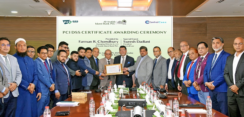 আল-আরাফাহ ইসলামী ব্যাংক (এআইবি) পিএলসি পেমেন্ট কার্ড ইন্ডাস্ট্রি ডেটা সিকিউরিটি স্ট্যান্ডার্ড (PCI DSS) সার্টিফিকেট অর্জন করেছে। বুধবার (২৯ জানুয়ারি) ব্যাংকের প্রধান কর্যালয়ে অনুষ্ঠিত হয়।