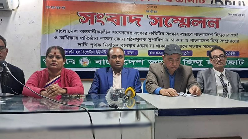 শুক্রবার (৩১ জানুয়ারি) অন্তর্বর্তী সরকারের সংস্কার কমিটির প্রস্তাবে হিন্দুদের স্বার্থ ও অধিকার প্রতিষ্ঠার লক্ষ্যে কোনো গঠনমূলক সুপারিশ না থাকা ও হিন্দু সম্প্রদায়ের দাবি অনুযায়ী আলাদা নির্বাচন ব্যবস্থার প্রস্তাব না থাকার প্রতিবাদে আয়োজিত এক সংবাদ সম্মেলনে তারা এসব দাবি জানান।