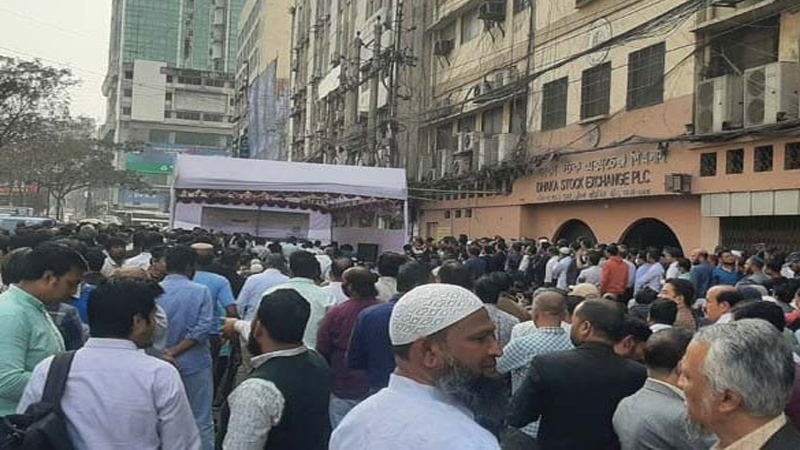 বাংলাদেশ ক্যাপিটাল মার্কেট ইনভেস্টর অ্যাসোসিয়েশনের (বিসিএমআইএ) ব্যানারে ১১ দাবি নিয়ে মতিঝিলের রাস্তায় সমাবেশ করছেন পুঁজিবাজারের ক্ষতিগ্রস্ত বিনিয়োগকারীরা। সোমবার (৩ ফেব্রুয়ারি) দুপুর আড়াইটার দিকে ঢাকা স্টক এক্সচেঞ্জের (ডিএসই) পুরোনো ভবনের সামনে এই সমাবেশ শুরু হয়। হাজারের বেশি বিনিয়োগকারী সমাবেশে উপস্থিত রয়েছেন।