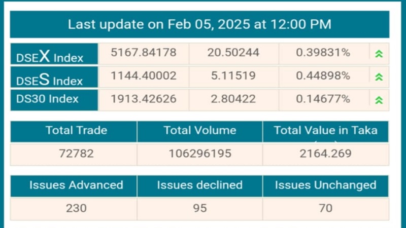 দেশের প্রধান পুঁজিবাজার ঢাকা স্টক এক্সচেঞ্জে (ডিএসই) সপ্তাহের চতুর্থ কার্যদিবস বুধবার (৫ ফেব্রুয়ারি) মূল্যসূচকের উত্থানের মধ্য দিয়ে চলছে লেনদেন। বেড়েছে বেশির ভাগ কোম্পানির শেয়ারদর।