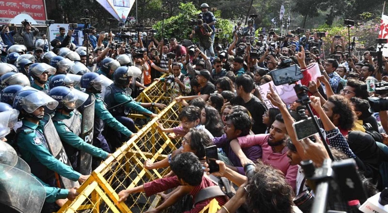 এ সময় বিক্ষোভকারীদের সঙ্গে আইশৃঙ্খলা রক্ষাকারী বাহিনীর সদস্যদের ধাক্কাধাক্কি হয়। বিক্ষোভকারীরা পুলিশের প্রতিবন্ধকতা সরিয়ে ফেলেন। তবে পুলিশের বাধার মুখে সচিবালয়ের দিকে এগোতে পারেননি তারা।