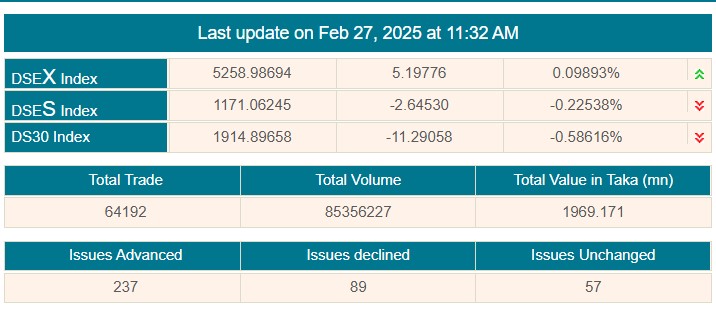দেশের প্রধান পুঁজিবাজার ঢাকা স্টক এক্সচেঞ্জে (ডিএসই) সপ্তাহের শেষ কার্যদিবস বৃহস্পতিবার (২৭ ফেব্রুয়ারি) মূল্যসূচকের মিশ্র প্রতিক্রিয়ার মধ্য দিয়ে চলছে লেনদেন। বেড়েছে বেশির ভাগ কোম্পানির শেয়ারদর।